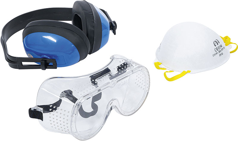 • cuffie antirumore (EN 352) indice attenuazione SNR= 26 attenuazione (H/M/L) 32/23/14 • mascherina antipolvere (EN 149) • occhiali di protezione (EN 166) • peso 240 g |
