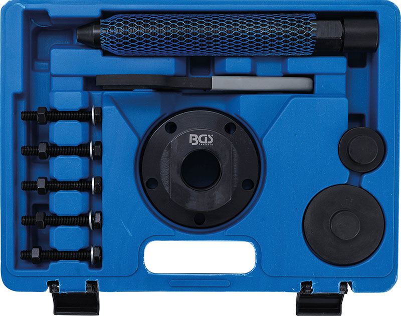 • per la rimozione del cuscinetto ruota anteriore e la rimozione del mozzo ruota • consente il ripristino del morsetto senza sostituzione del mozzo ruota • composto da: - estrattore con chiave di ritenuta - set viti (5 pz.) - piastra di compressione (grande) - piastra di compressione (piccola) - mandrino con attacco esagonale • peso 7,1 kg |