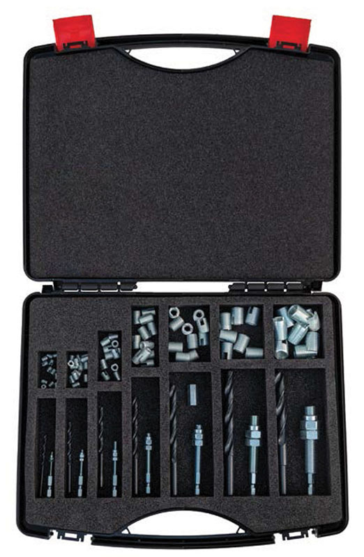 Kit bussole auto-filettantiacciaio zincato con utensile per il montaggio a macchina con attacco 1/4" e punta HSS