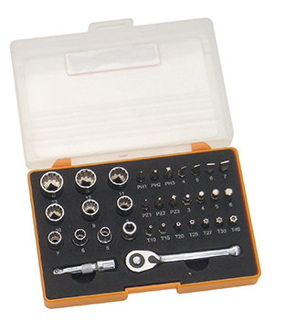 set inserti e bussole multimpronta da 5 a 13 mm con mini cricchetto reversibile e prolunga l. 50 mm• attacco: 1/4"• impronta: spline drive