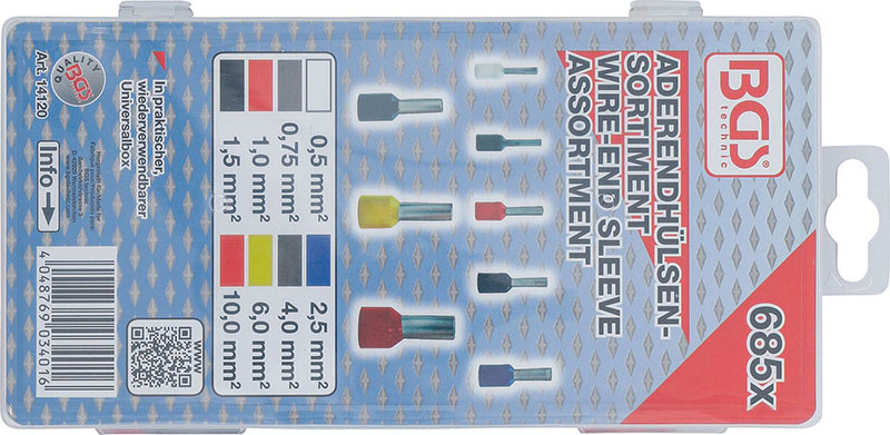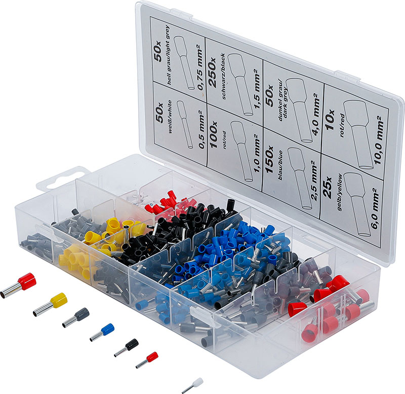 • isolati • comprende (numero pezzi x per dimensioni cavi):- 50 pezzi: 0,5 mm² - 0,75 mm²- 100 pezzi: 1,0 mm²- 250 pezzi: 1,5 mm²- 150 pezzi: 2,5 mm²- 50 pezzi: 4.0 mm²- 25 pezzi: 6.0 mm²- 10 pezzi: 10.0 mm²• in box in plastica• peso 190 g