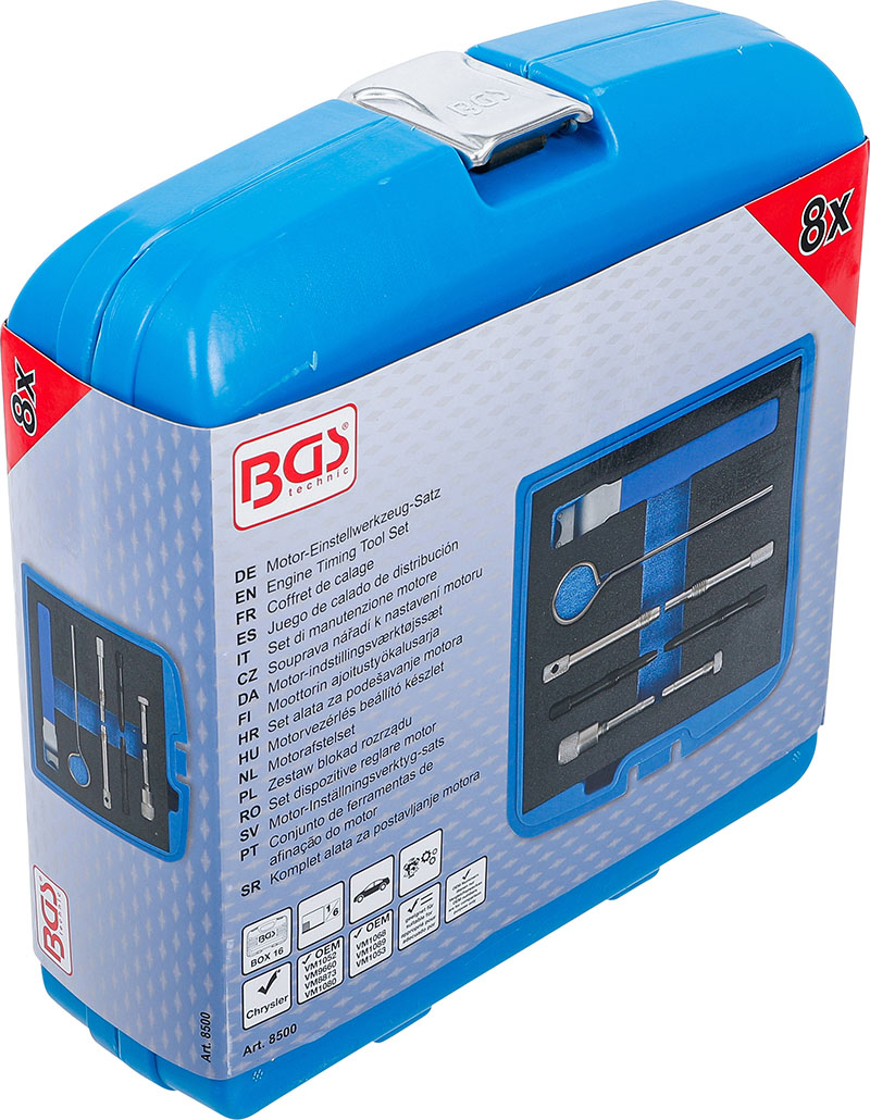 • per il controllo e la regolazione della messa in fase del motore • per: - Chrysler Voyager, Grand Voyager R2516C,R2516L,R2816K - Jeep Cherokee (01-08) 2.5 / 2.8 - LDV Maxus (05-08) VM2516L • perno di chiusura per l’albero a camme (interna) come OEM VM1052 • perno di chiusura dell’albero a camme ( scarico) come OEM VM1053 • perno di chiusura per il volano ( Voyager , Grand Voyager2.5/2.8 e LDV Maxus) come OEM VM1068/ VM1089 • perno di chiusura per il volano ( Jeep Cherokee 2.8) come OEM VM1080 • perno di chiusura per il volano ( Jeep Cherokee 2.5) come OEM VM8873 • tensionatore come OEM VM9660 • perno di bloccaggio per il bilanciamento dell’asse • perno di bloccaggio per volano • per i motori R425, in alternativa all’utensile di fissaggio del pignone dell’albero a camme è possibile utilizzare un fermo universale, per uso come OEM VM1055 (es. art. BGS 1714) • peso 1,0 Kg |