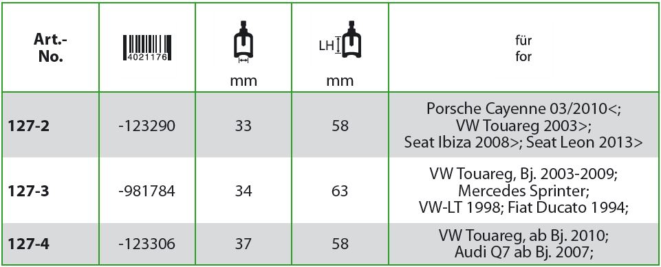 Il estrattore per giunti sferici a diretto contatto con forma a campana della serie 127 viene utilizzato per estrarre i perni sferici durante lo smontaggio dei giunti sferici e delle testine delle aste di sterzo in ambito Automotive e Industriale. L'estrattore consente un lavoro senza danni ed è ottimale quando c'è poco spazio disponibile.