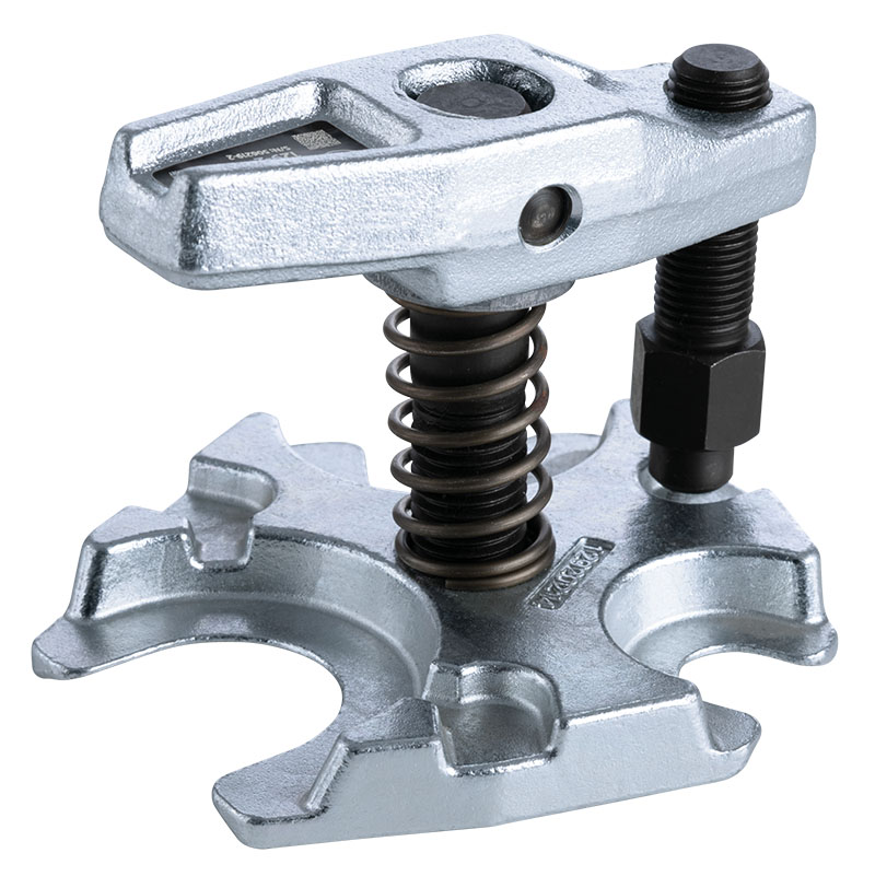L'estrattore per snodi sferici con rapporto di leva della serie 129 viene utilizzato per estrarre i perni sferici durante la rimozione di snodi sferici e i giunti delle barre dello sterzo sulle barre dello sterzo, universalmente per automobili, furgoni e camion medi. Grazie al suo rapporto di leva, l'estrattore per snodi sferici può applicare molta forza anche in spazi ristretti. La serie 129 convince per la sua varietà di applicazioni. Il campo di serraggio della leva è regolabile tramite la filettatura del mandrino centrale.